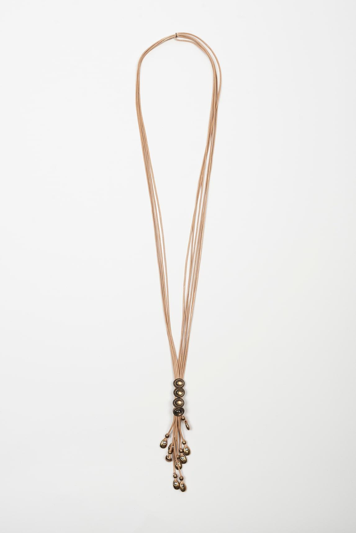 Nesta versão, os detalhes são fabricados em latão, oferecendo um tom de ouro envelhecido que se harmoniza com a base do colar e reforça o seu carácter quente e natural. A combinação cria um efeito uniforme e elegante, ideal para looks em tons de areia, camel, linho natural ou terra.