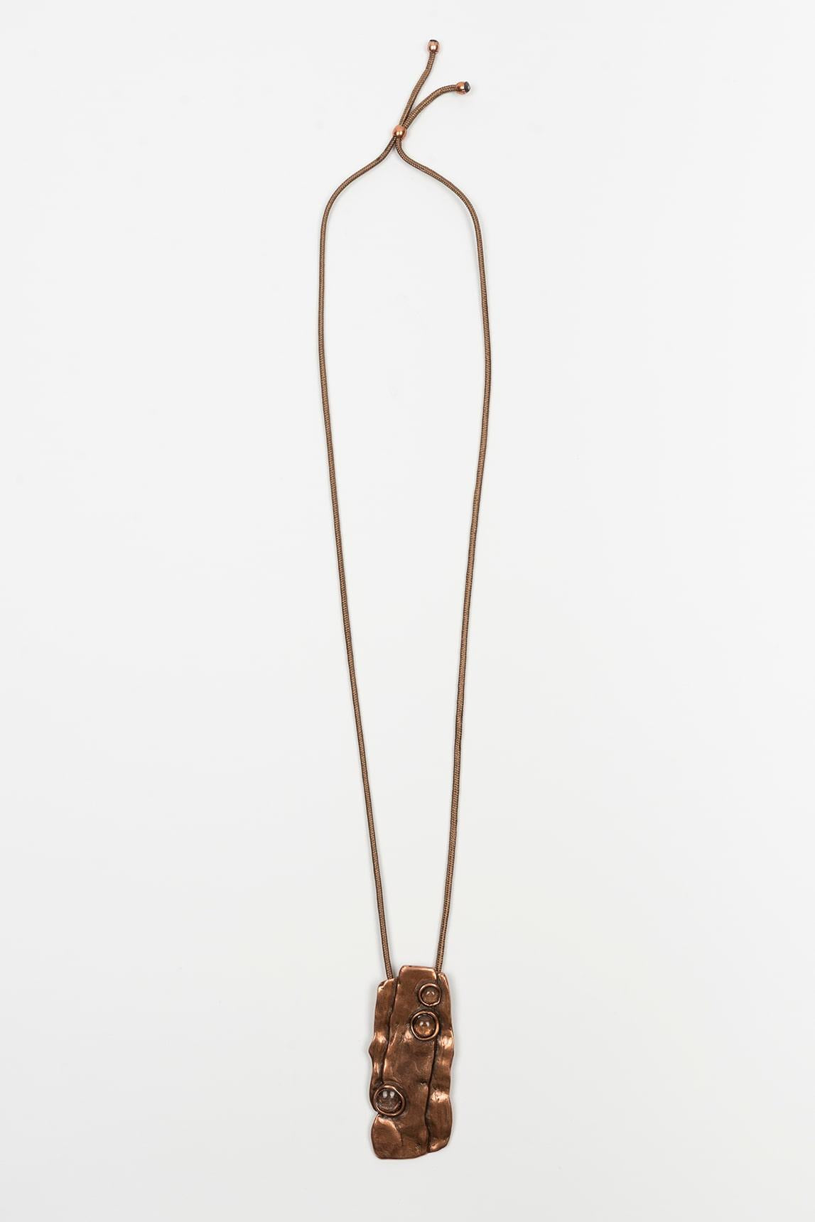 El collar Tavira en cobre presenta la misma estructura larga y limpia con colgante central de textura marcada que aporta dinamismo y personalidad. El acabado cobre añade profundidad y calidez, realzando especialmente estilismos en blanco, beige, verde oliva o tonos tierra. Su brillo suave aporta un matiz distintivo sin resultar excesivo, manteniendo la elegancia estructural del diseño. Con fuerza visual y equilibrio, el Tavira en cobre es ideal para looks minimalistas que buscan un punto diferenciador. Nos esforzamos por mostrar los colores de la forma más fiel posible, pero pueden variar ligeramente respecto a la realidad.