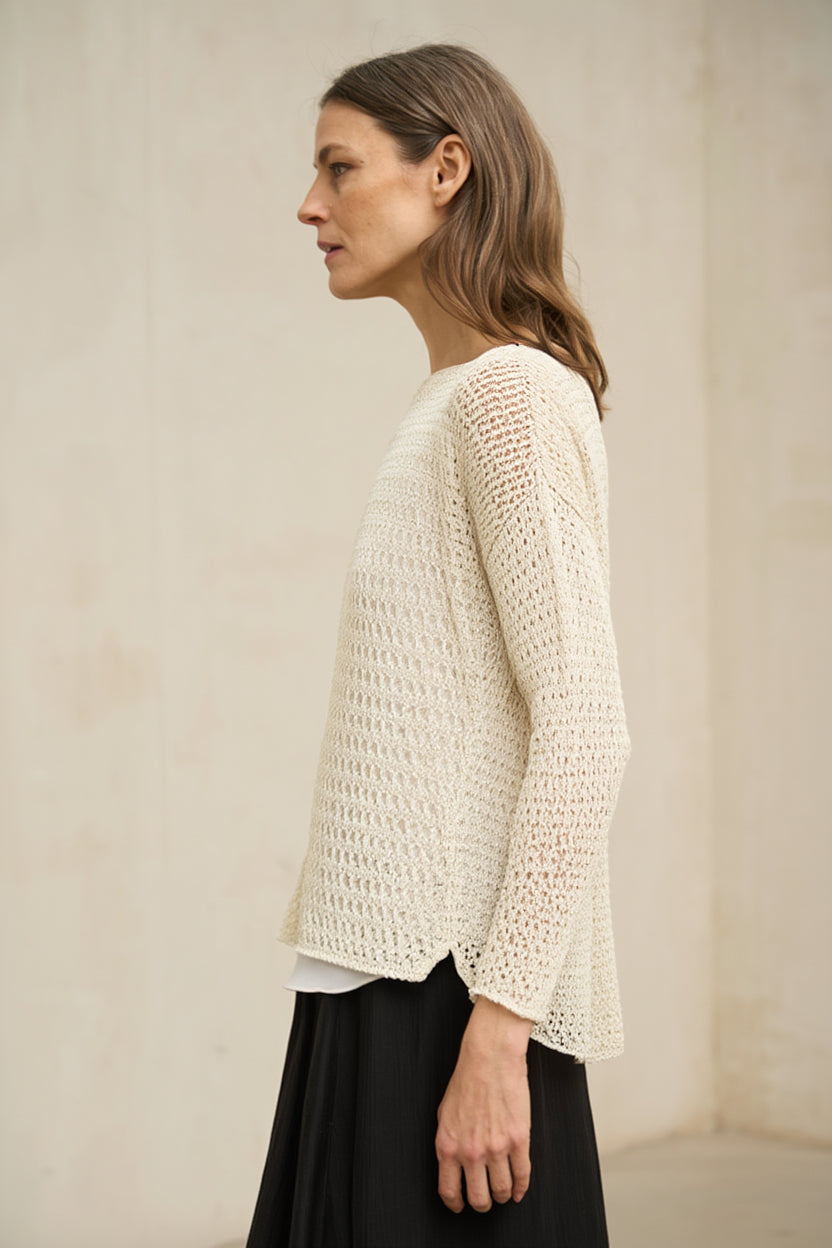 A camisola Lúvena cru é uma peça leve, confecionada em malha fina com textura vazada na parte superior, criando um efeito visual subtil e um acabamento delicado. O seu tecido é ligeiramente translúcido, pelo que recomendamos a sua utilização por cima de uma t-shirt ou blusa básica (não incluída). Para um look clean e harmonioso, sugerimos a blusa Alenia off-white, criada como a base perfeita para este tipo de peças com textura vazada. A peça apresenta um amplo decote redondo e mangas a três quartos, com um corte suave que realça a silhueta sem ser demasiado justo. A sua leveza torna-a uma escolha ideal para a meia-estação ou para usar sobre peças mais leves. O tom branco-sujo traz luminosidade natural e elegância serena, combinando na perfeição com looks neutros, bem como com tons de areia, taupe, camel ou terra. Uma peça versátil que equilibra a simplicidade e a textura com um toque requintado e contemporâneo. Esforçamo-nos por exibir as cores da forma mais precisa possível, mas podem variar ligeiramente da realidade.