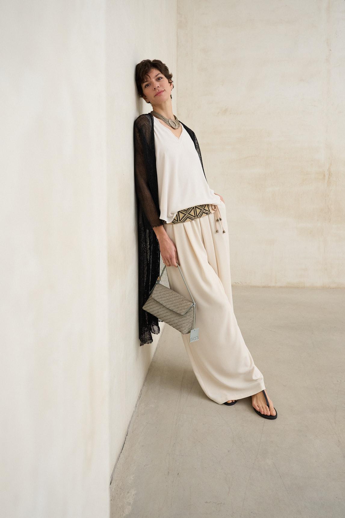 El tejido de punto es sutilmente translúcido, lo que permite jugar con las capas y contrastes. Para un acabado limpio y equilibrado, recomendamos combinarla con un top básico como el Top Alenia blanco roto (no incluido). Las mangas tres cuartos y la caída suave refuerzan su carácter sofisticado y contemporáneo.