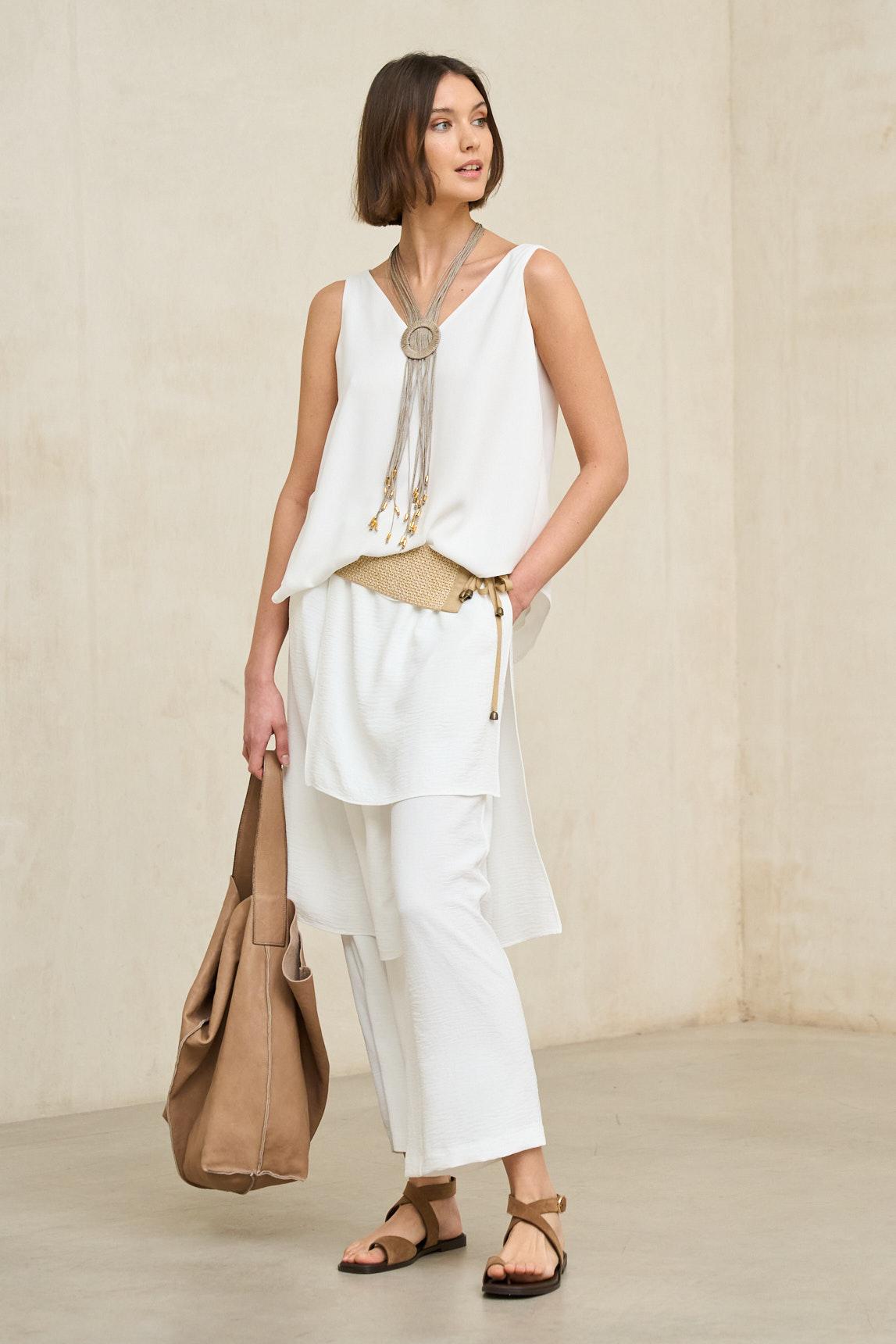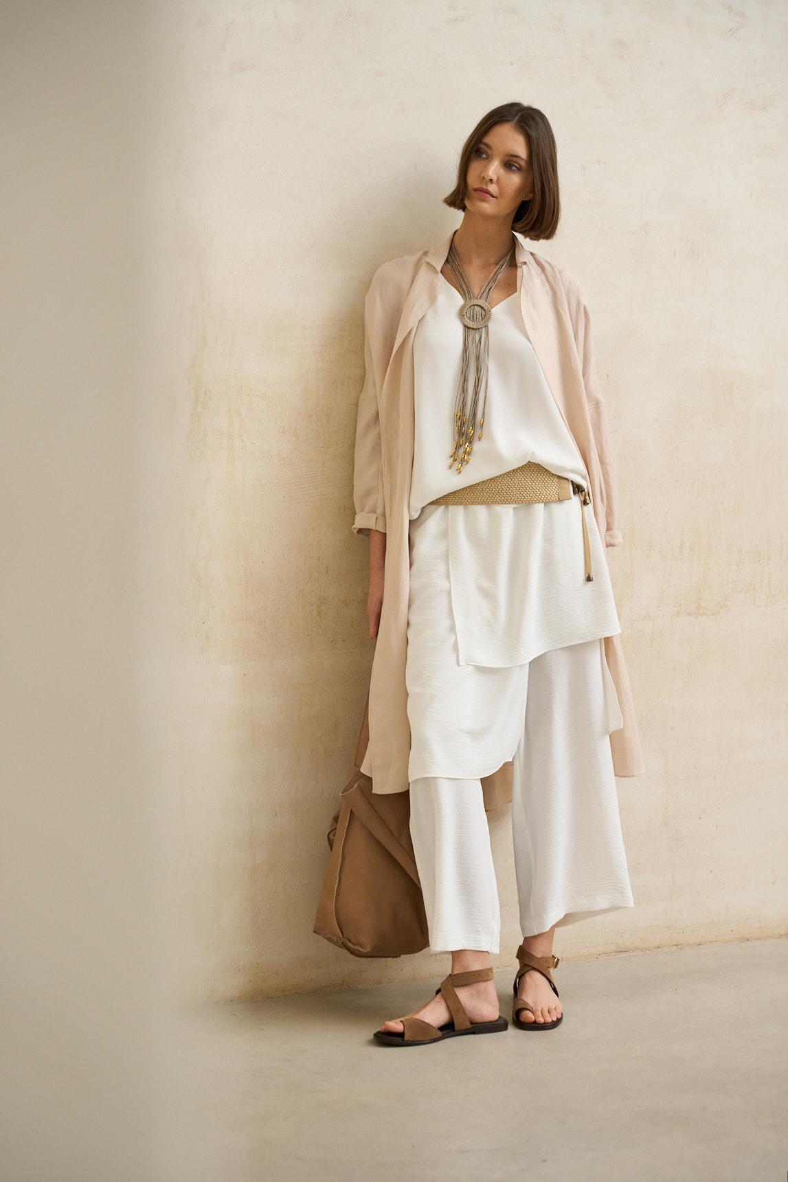 Com cós elástico franzido e cordão ajustável, estas calças com efeito saia vêm num tom branco luminoso que realça a sua textura subtilmente enrugada. A frente trespassada cria um decote elegante com uma discreta racha central, e a bainha cai com uma ligeira assimetria que confere movimento sem sacrificar a simplicidade. A silhueta é fluida e confortável, com um comprimento midi concebido para acompanhar os seus movimentos. A sua estética minimalista adapta-se a diferentes estilos: use com uma blusa justa para equilibrar o volume, com uma camisa leve para um look mais sofisticado ou com uma t-shirt básica para um look casual. Fica fresco e perfeito para o dia a dia com sandálias rasas; com mules ou anabelas, ganha presença para uma saída à noite ou um jantar. Também disponível em bege areia. É uma peça que ilumina qualquer look sem esforço e é ideal para compromissos longos: confortável na cintura, favorecedora graças ao decote cruzado frontal e perfeita para criar visuais serenos que parecem impecáveis ​​desde o primeiro instante. Esforçamo-nos por exibir as cores da forma mais precisa possível, mas podem variar ligeiramente da realidade.