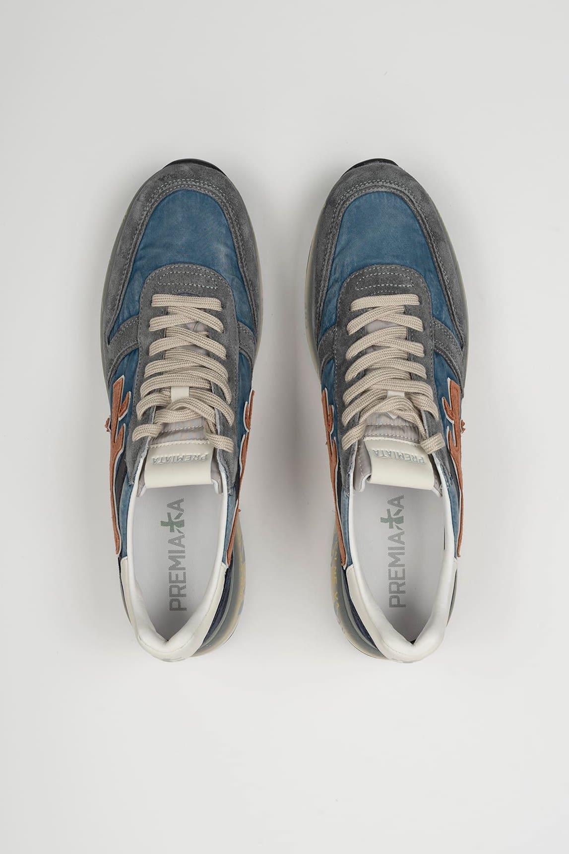 Os ténis Premiata Mick 7215N reinterpretam o estilo clássico de corrida numa combinação de tons azuis, cinzentos e neutros que proporcionam profundidade e equilíbrio visual. A sua construção mistura camurça e tecido técnico, criando uma interação singular de texturas.