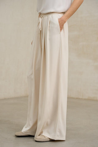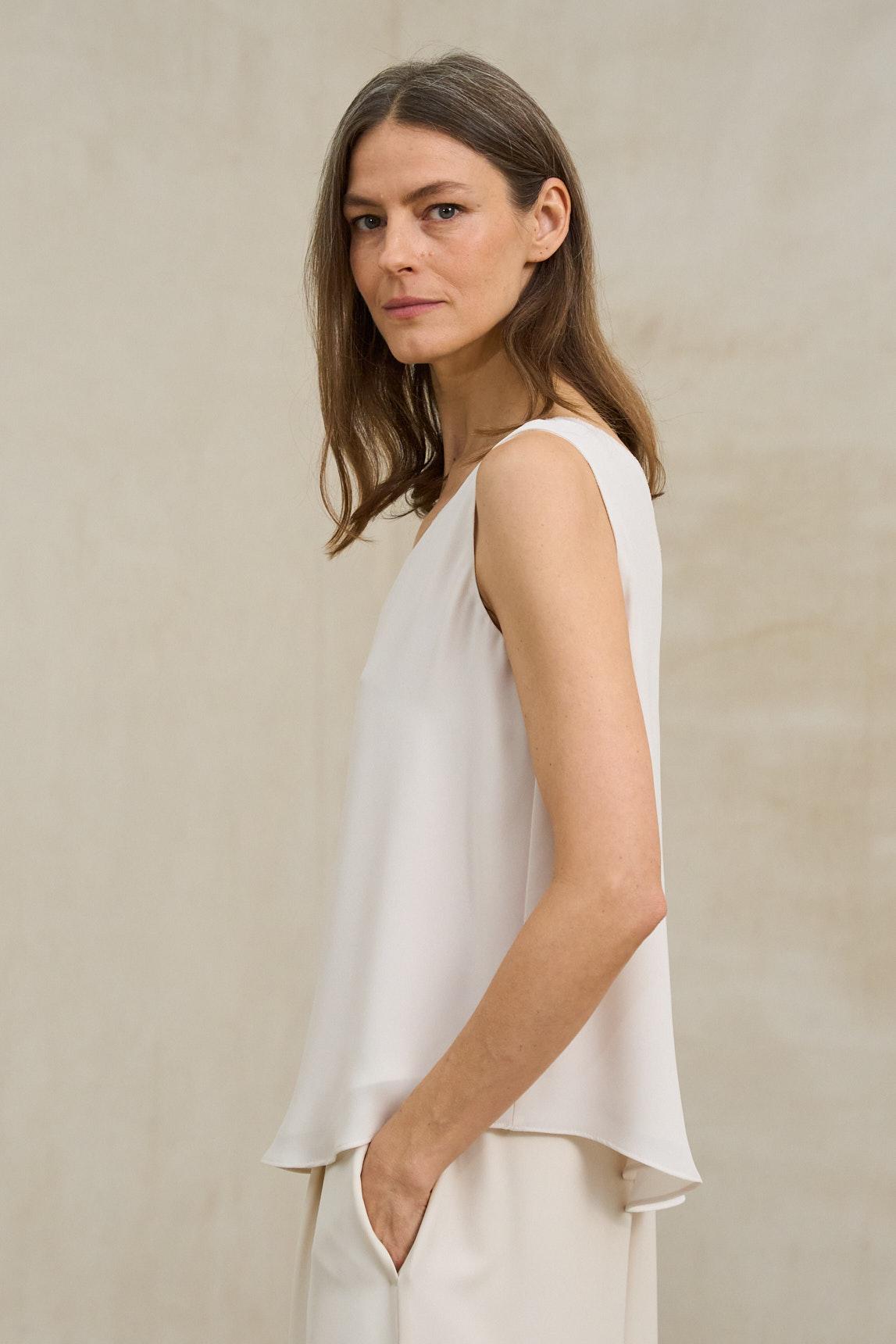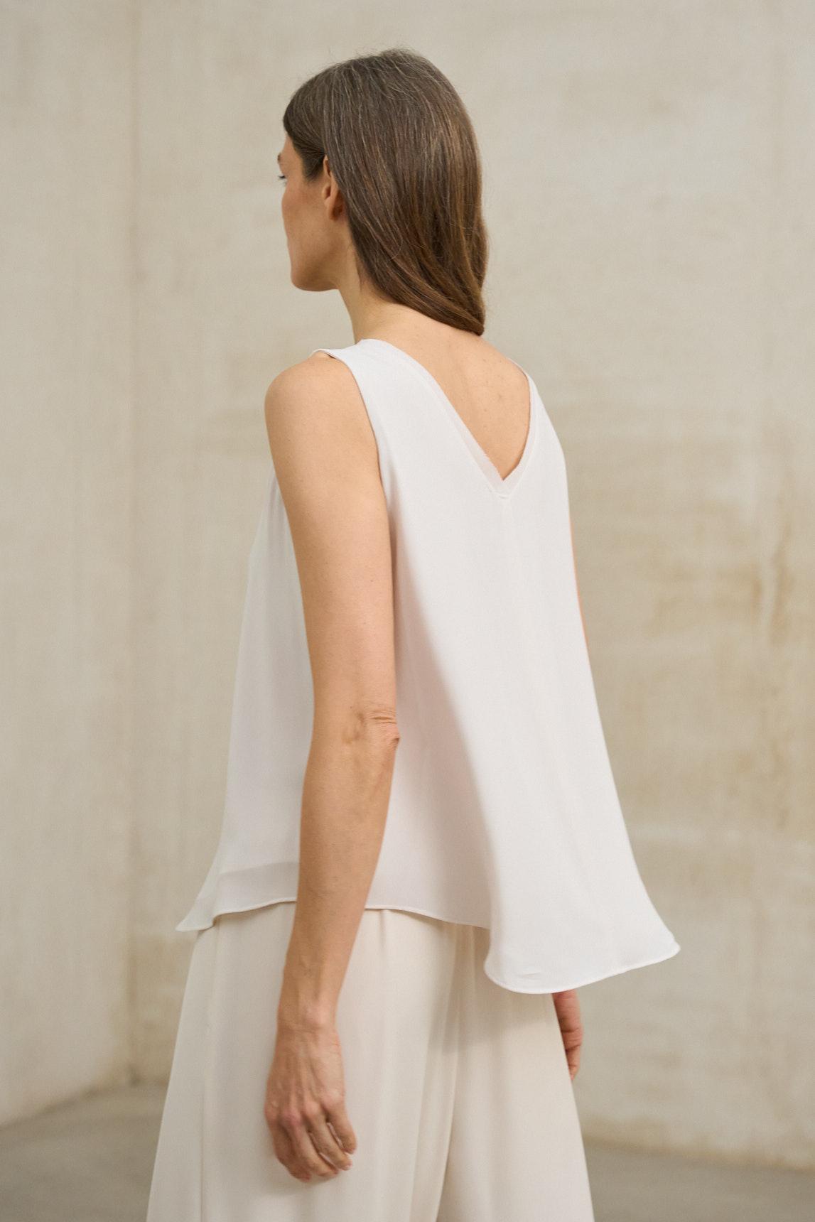 Este top sin mangas presenta una silueta ligera y amplia, definida por un escote en pico delantero y trasero que estiliza la parte superior. El tejido muestra una caída suave y continua, con un acabado liso que potencia la sensación de fluidez. El bajo ligeramente redondeado aporta movimiento y refuerza su estética relajada, mientras que el corte suelto permite que la prenda acompañe el cuerpo sin ajustarse.