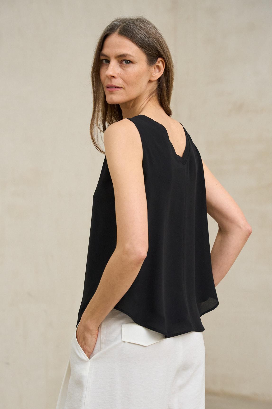 Este top sin mangas se caracteriza por su silueta amplia y su escote en pico pronunciado tanto en el delantero como en la espalda, generando una línea limpia y favorecedora. El tejido presenta una superficie lisa con caída fluida que aporta movimiento y ligereza visual. El bajo ligeramente redondeado suaviza la estructura general, mientras que el corte suelto permite un ajuste cómodo y natural. Desde el punto de vista estilístico, es una prenda esencial con un aire sofisticado. Su diseño minimalista lo convierte en una base perfecta para estilismos tanto de día como de noche, combinando con pantalones estructurados, faldas midi o incluso capas superpuestas. El negro intensifica su carácter elegante y facilita combinaciones monocromáticas o contrastes con tonos claros. Pensado para adaptarse a múltiples ocasiones, este top aporta versatilidad y equilibrio. Se lleva con facilidad, estiliza la silueta y se convierte en una pieza clave para construir conjuntos depurados, contemporáneos y atemporales. Nos esforzamos por mostrar los colores de la forma más fiel posible, pero pueden variar ligeramente respecto a la realidad.